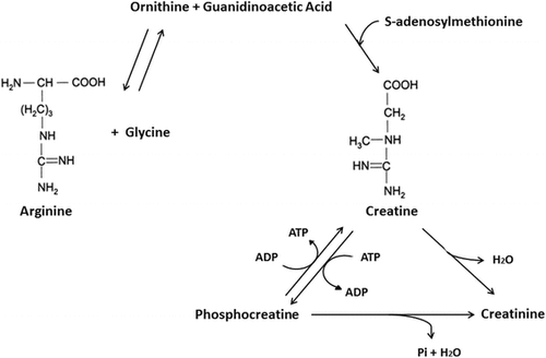 Fig. 1 Estructura química y vía bioquímica para la síntesis de creatina. De Kreider y Jung [Citation6]